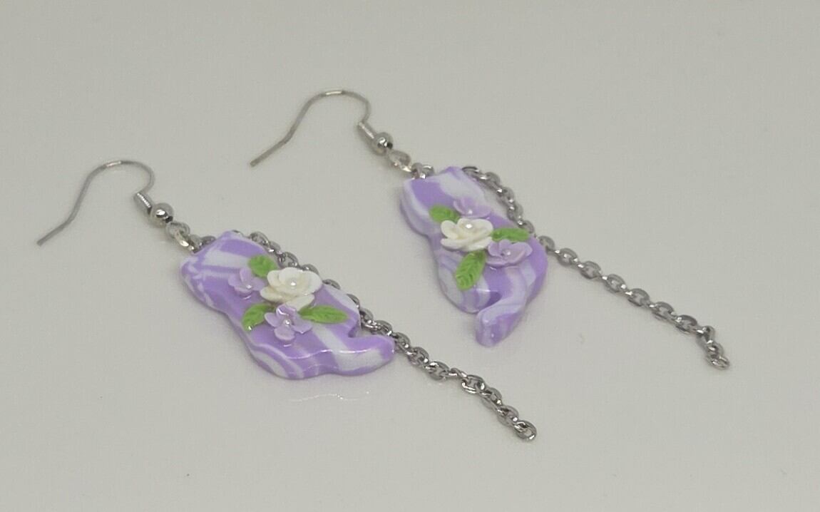 可憐な花をまとった猫のシルエットが魅力的な花ねこピアス(薄紫)!