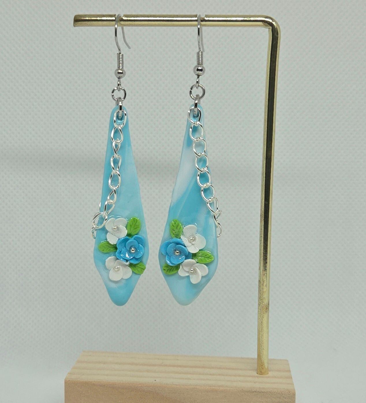 花ピアス(スカイブルー)は、ポリマークレイを使用し、ひとつひとつ丁寧に製作された手作りのアイテムです。スカイブルーの地に小さな花をあしらったデザインは、シンプルながらも目を引く美しさを演出します。デイリーコーデにぴったりなだけでなく、特別な日にも華やかさを添えるスタイルを提供する一品です。軽量なので着け心地が良く、長時間の使用でも快適に過ごせるため、さまざまなシーンで活躍すること間違いありません!